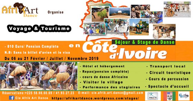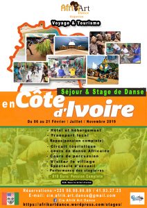 Le stage de danse, et de percussion, se déroule au sein de la Fabrique culturelle, espace de pratique et de diffusion artistique (sis à cocody, deux plateaux), et à l’univers-cité sompohi Gothimaslogie (centre culturel Africain), sis à yopougon. Avec la compagnie Afrik art Dance, 4h matin et 4h l’après-midi. Le Centre dispose de deux salles de danse, une scène de spectacle, un restaurant, wifi gratuit, une galerie d’art.